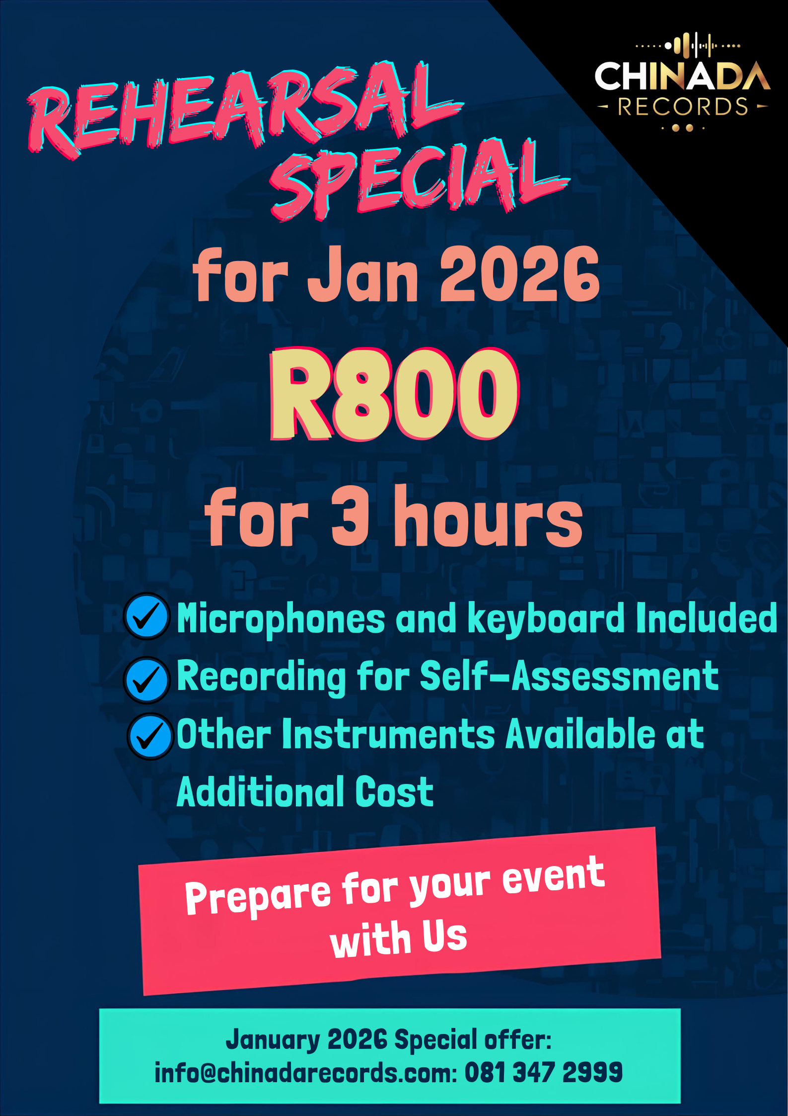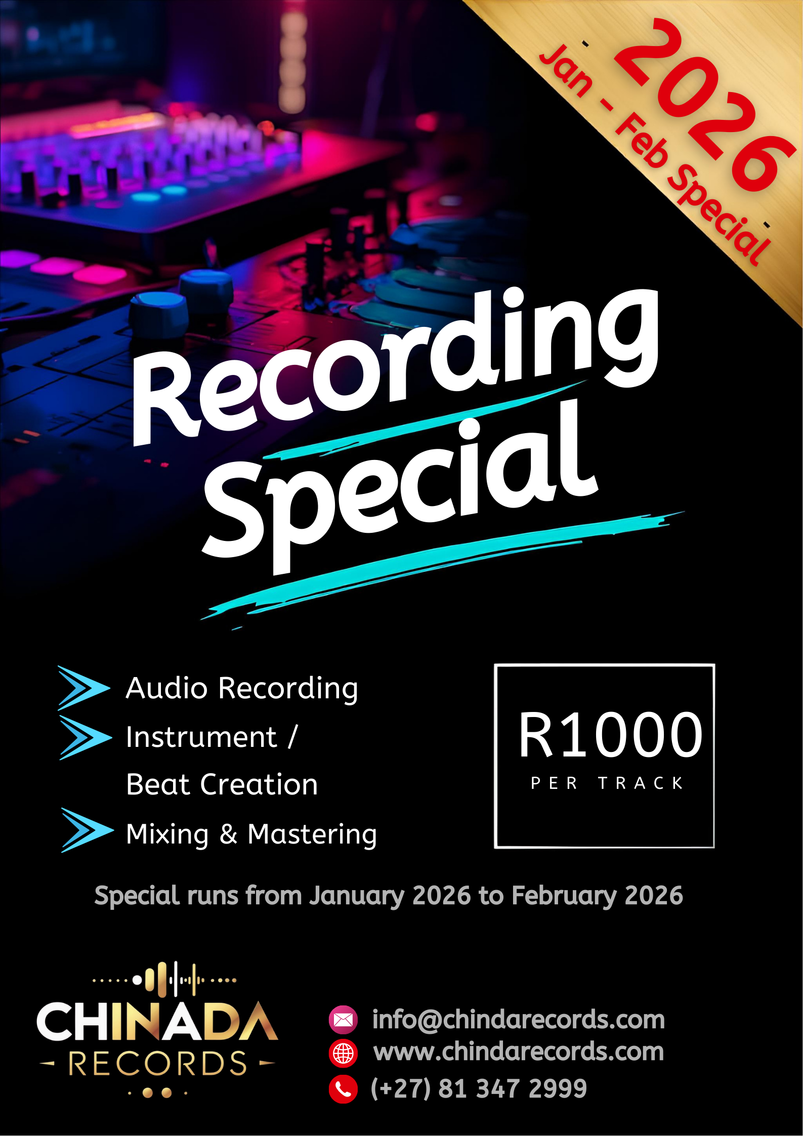 Chinada Records is offering an incredible recording special from January to February 2026! For just R1000, enjoy comprehensive packages that include recording, instrumentation, and mastering. Elevate your sound with us and take your music to the next level. Don't miss this chance to enhance your creative journey!